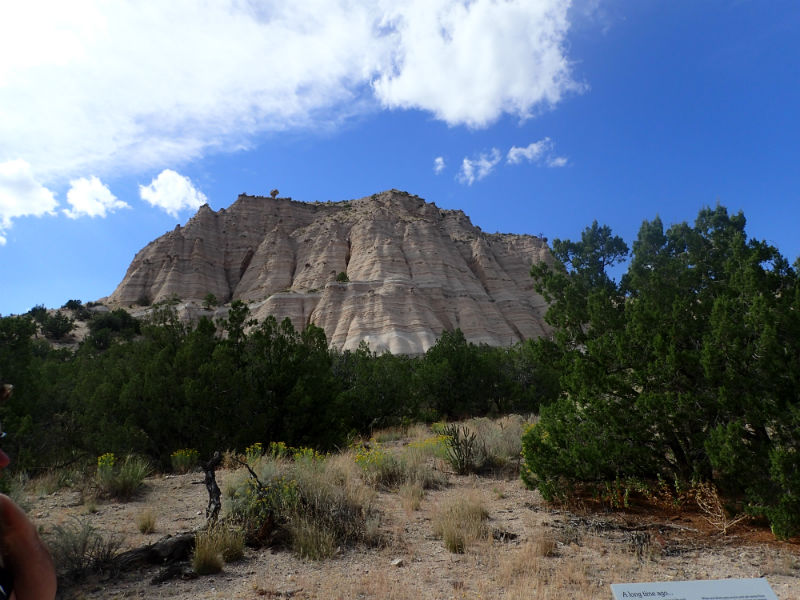 Our first adventure was to Kasha-Katuwe Tent Rocks National Monument. (No, sis, I didn't get our passports stamped. Dang! This is managed by the BLM, not NPS) It's about 40 miles outside of Santa Fe--a beautiful, scenic drive. $5 admission got us in. No visitors center or amenities, but the bathrooms were a step up from port-a-potties, so that was good. We should have brought more water!Here are the rocks for which the area is named. See, they look like TENTS. Get it?? At this point I should mention I was carrying our new Olympus T-4, which is waterproof and shockproof and babyproof...but has plastic over its lens, and the plastic is often subjected to fingerprints and smudging. I never think to wipe it before taking a picture. Blast. We did the Cave Loop Trail. BH started in the woven in a FWCC, PX was on back in the Ergo. Then PX wanted down and BH wanted dad, so she ended up on his back in the Ergo. PX drew pictures in the sand explaining how the great volcanoes of long ago (the 1980s) created the tent rocks. Ha! The tail was well-marked, with signage explaining the cave (couldn't go near/in, it's on the side of the cliff) and the tent rocks. Next time I'd like to do the Slot Canyon Trail, which goes high above the trail we were on. The guide book specifically said it wasn't for people carrying babies on their back. Haters. Kidding--there are narrow passages. And taking babies to the top of a cliff doesn't sound like the safest idea unless they're both securely wrapped, which PX was not. Next time!