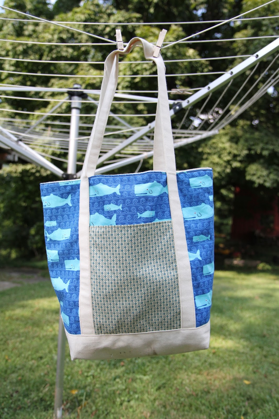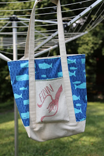 The boy's bag. It's the "Great Big Tote" from Virginia Lindsay's Sewing to Sell: How to Sell Locally & Online. Hm. More on the book another time. For now, let me just say I requested it from the local library BEFORE I found out about CPSC/local/state/fed requirements. So it is great, but the topics covered have taken a backseat to legal stuff for now. Back to the bag: I completely redid all the measurements to make it more Finn-sized. It's about 14 x 16 x 2.5, with 18 inch straps. It's a bit large! The pockets are just right for storing contraband toys, like trains and dinosaurs.