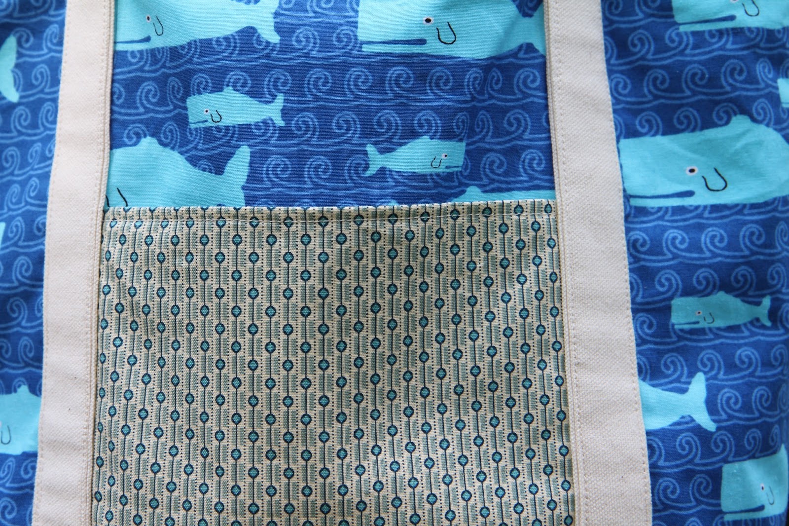 The front pocket is a squid, colored with heat-set crayon and gel pen. It is lined with a DS Quilts print, which I used again for the back pocket. The teal doesn't read quite right from far away, but up close I really dig it. The sperm whale fabric is from the "Don't be Crabby!" line for Robert Kaufman.