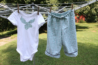 The onesie was leftover from the pile of blanks I bought for PX's monthly onesies. I had the Wonder-under (actually...not Wonder-under. Wonder-under is the "Kleenex" of fusible stabilizers. This was actually Heat and Bond Lite), thread, and elastics, so this little set cost me nothing but time. In other news, moose antlers are really REALLY hard to stitch around. The onesie stretched (knits! ahrg!) and the plaid stretched and it isn't perfect. Next time I'll try with an open-toe foot.